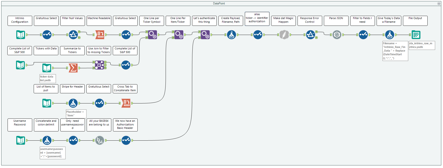 Allowing for some testing and distractions, it took me about three more weeks to get two workflows up and running. The first workflow just gathers the data: It inputs the authentication credentials, the tickers that had't had data pulled yet, the list of metrics to pull. It appends credentials to tickers to metrics and compiles the complete list of remaining API calls needed and sends them off to Intrinio. The successful results get stored in a time-stamped output file after a minimum of processing - just enough to get the data parsed into clean columns and time-stamped.
