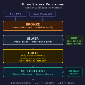 A Bronze layer pulls raw orders data from the Toast POS API and weather data from Open-Meteo's historical archive and forecast APIs.